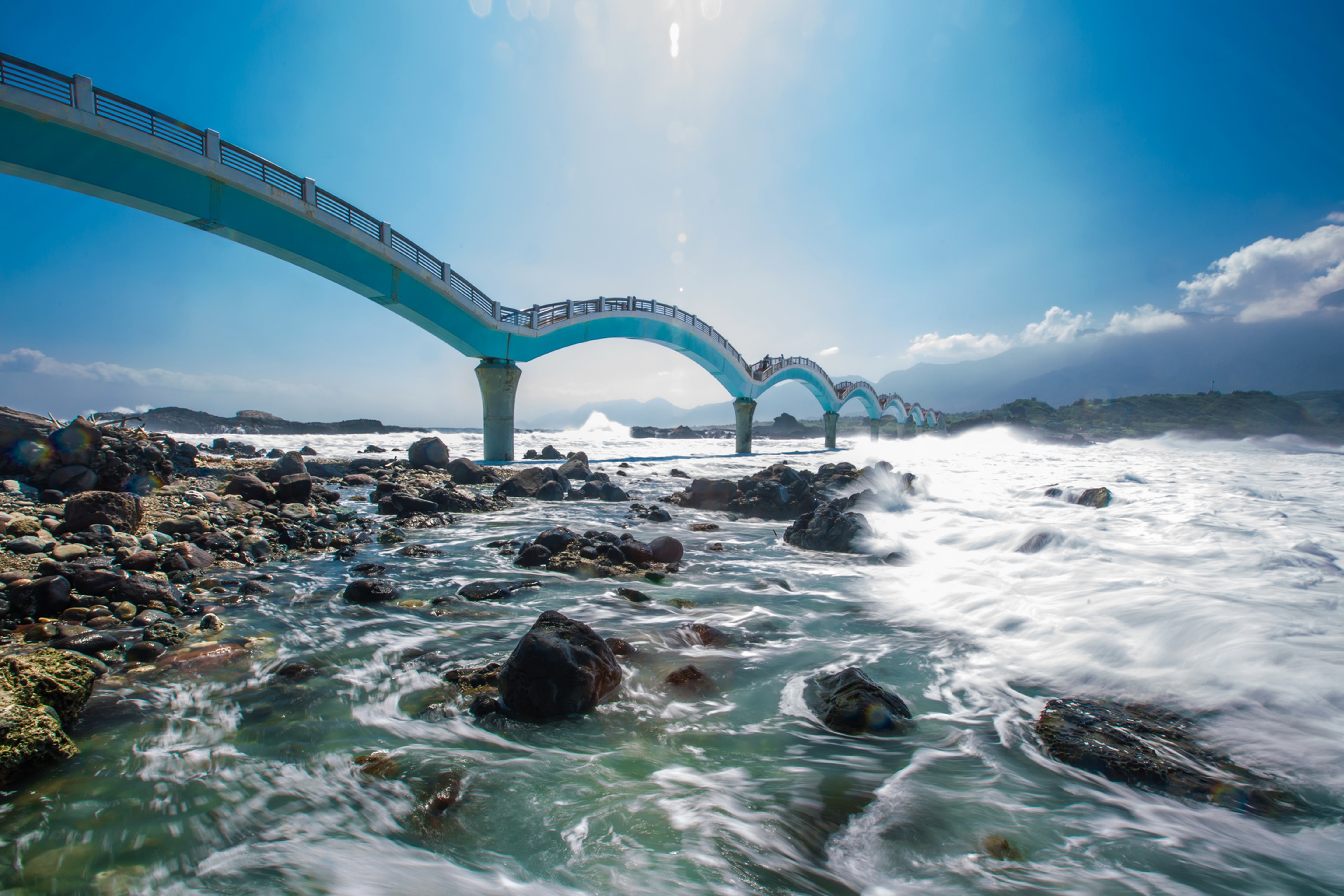 三仙台的八拱紅色跨海步橋,造型如長龍臥波,氣勢壯觀;島上地形景觀與生態資源極為獨特稀有,海岸植物種類繁多,是研究海岸植物生態的重要據點,可循規劃良好的步道觀賞沿途生態及地質觀賞。上島遊覽約需2小時,遊走其間可欣賞壺穴、海蝕洞、海蝕溝、海蝕凹璧等特殊地形,以及珍貴稀有的海濱植物。