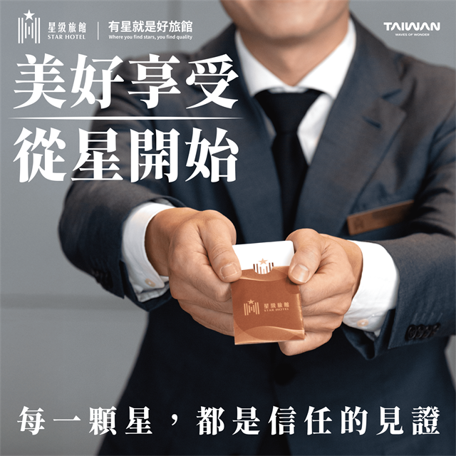 「星級旅館」用品質與服務打動旅客的心。無論是出差商旅、家庭出遊或療癒個人小旅行,選擇「星級旅館」,讓政府幫忙把關。從硬體設備到軟體服務,以旅客角度出發的評比標準,幫助旅客快速辨識出值得信賴的旅館。目前已有逾 160 多家旅館通過評鑑,從1星(基本級)、2星(經濟級)、3星(舒適級)、4星(全備級)、5星(豪華級)到卓越5星(標竿級),每一顆星,都是對住宿品質的承諾,幫助旅客選擇符合需求的住宿。