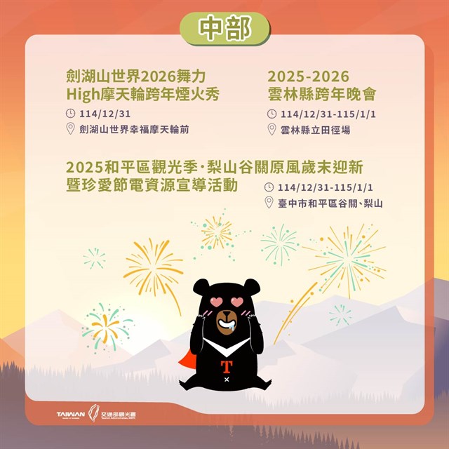 今年跨年活動橫跨全臺,從山巒、海洋、樂園到離島,每一地區都端出最具特色的節目與景觀,更多活動資訊請洽觀光署國家風景區管理處、主題樂園及縣市政府相關網站查詢。另因活動期間遊客眾多,建議民眾參加跨年及迎曙光活動時,可多搭乘公共運輸或接駁車,並事先做好保暖禦寒準備,讓新的一年玩得開心又安心。