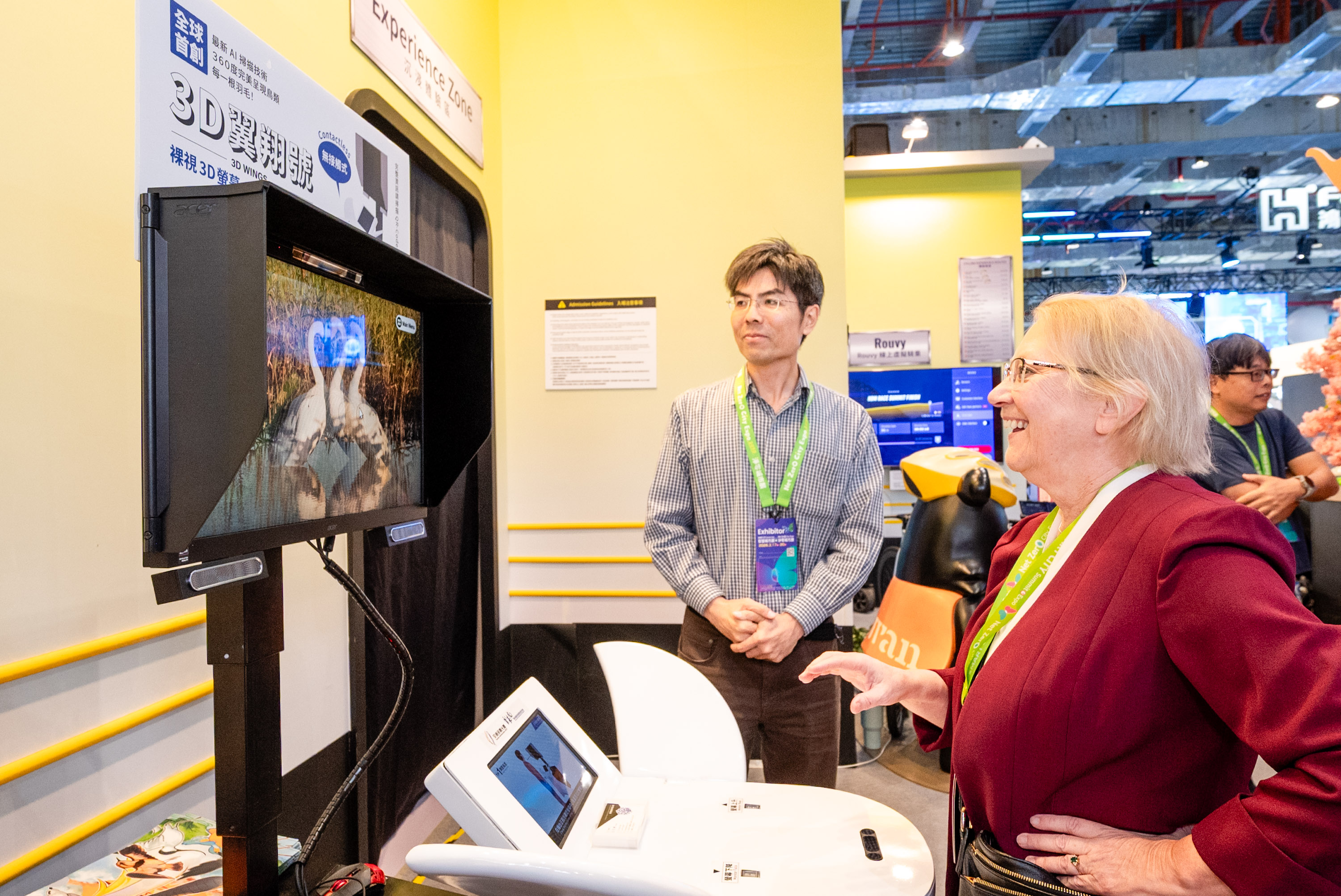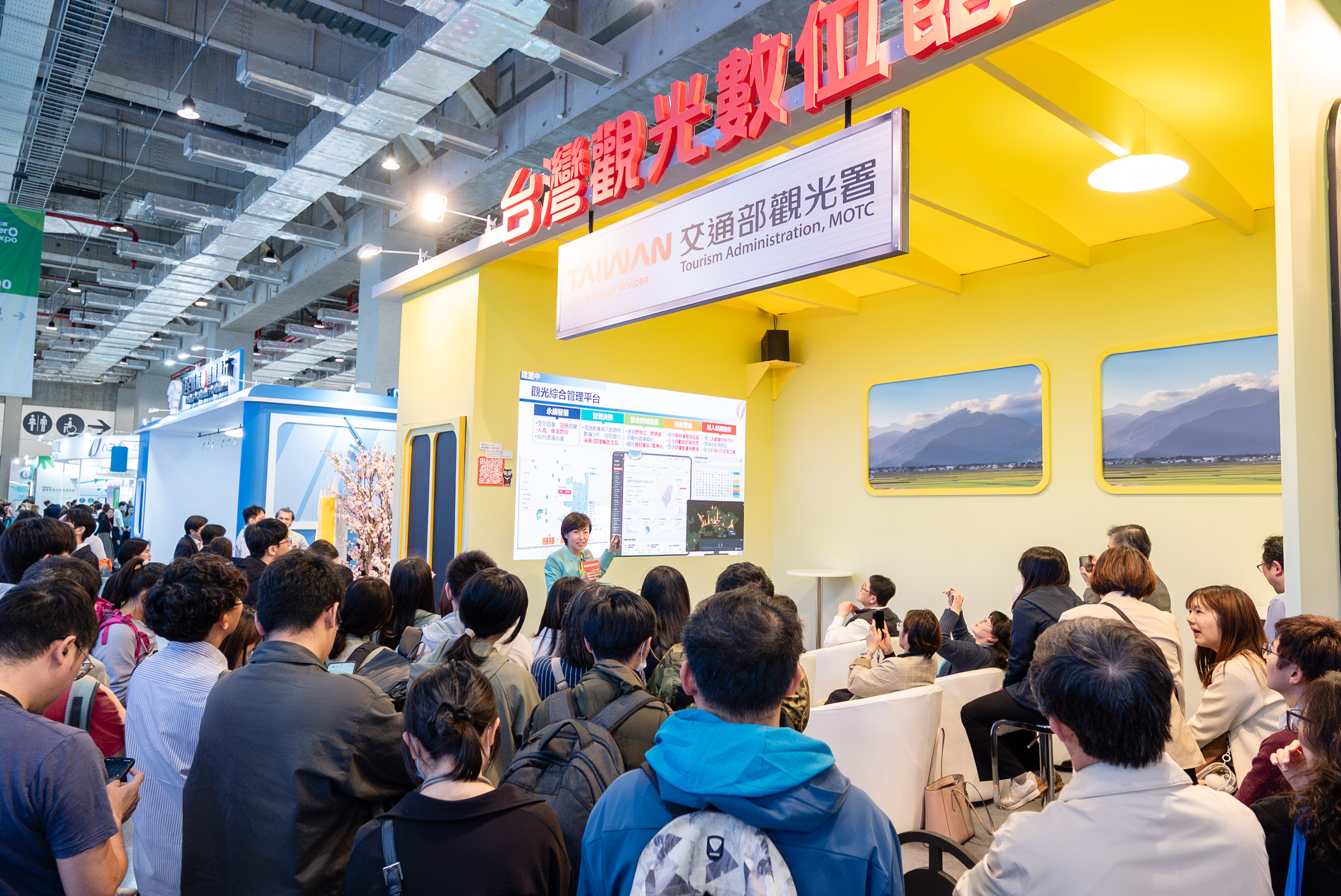 「台灣觀光數位館」將「台灣百Ways」六大主題概念融入展區設計,感受觀光署結合AI技術與個人化智慧遊程的行銷巧思。展館體驗旅程由象徵「文化」指引的「AI 解籤」揭開序幕,系統即時解析籤義並結合五行概念,量身客製專屬個人景點。再依循籤詩引導展開旅程:透過「AI 調香」與「AI 調飲」喚醒特有的「浪漫」台灣味與「美食」味蕾;隨後步入「山嵐號」沉浸車廂,飽覽台灣山海風光,再以3D裸視技術觀察鳥類,感受自然「生態」之美;並提供19條自行車虛擬騎乘路線,動態體驗「樂活」,最後回到台北101打卡牆,象徵台灣「購物」魅力。現場更提供「喔熊AI小幫手」互動服務,為旅客規劃兩天一夜的遊程,將AI技術轉化為實用的旅遊工具,玩出智慧觀光新高度。