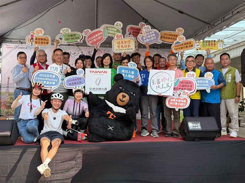為推廣永續觀光並落實低碳生活,交通部觀光署今(21)日於茂林國家風景區管理處新威遊客中心,啟動《出發吧!臺灣騎時很美麗-2026自行車系列活動》。陳玉秀署長、林倩綺立委、高雄市政府觀光局江俊昌主任秘書、國家風景區管理處同仁們、相關在地公協會及熱血車友,在美濃迷人的桃花心木林與田園間一「騎」出發,象徵今(2026)年度全台自行車接力盛事正式揭幕,共同開啟透過雙輪探索島嶼深度之美的嶄新篇章。