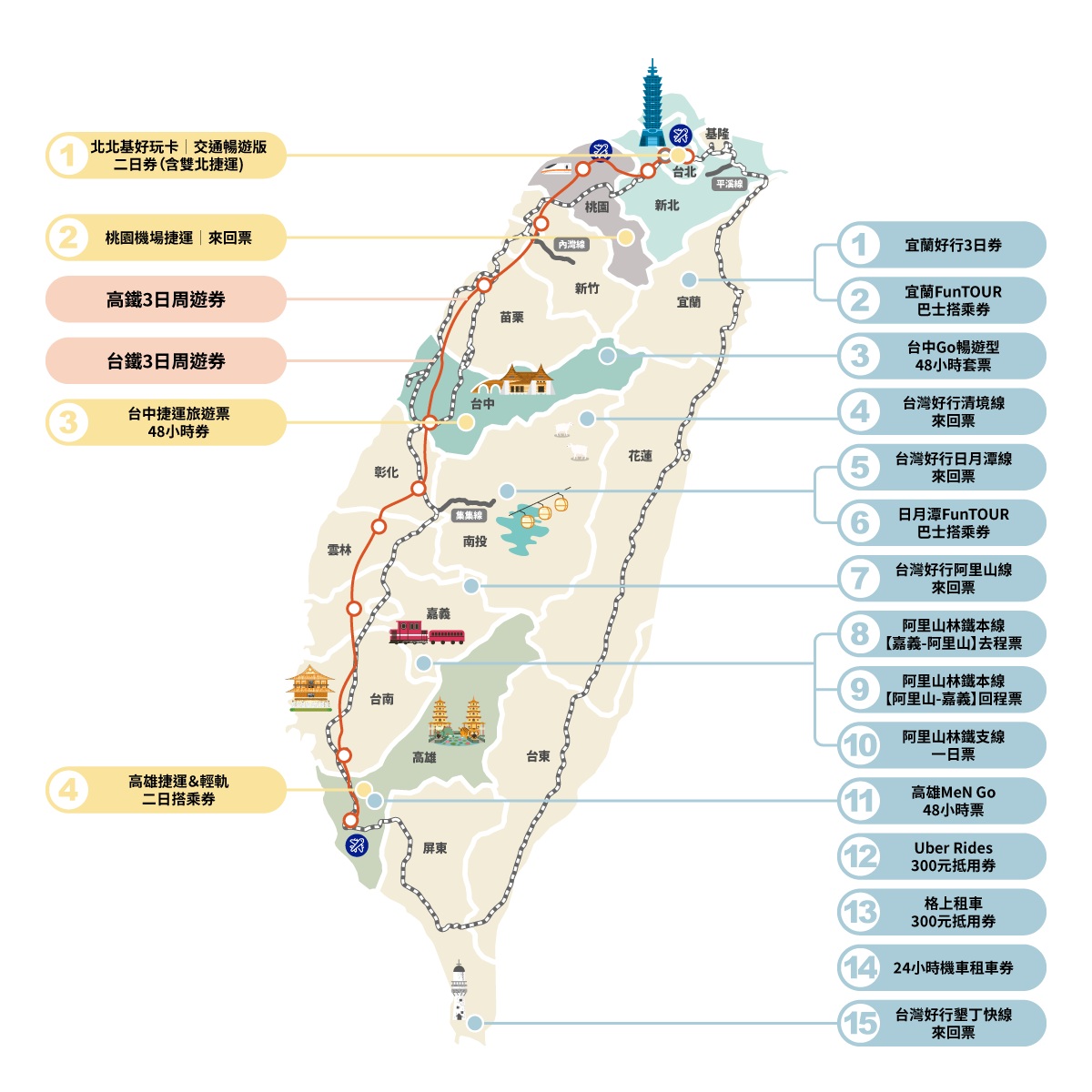 2.台鐵版:國內、外旅客皆適用,定價2,500元,含台鐵3日周遊券、都會捷運4選1、景區接駁15選1。